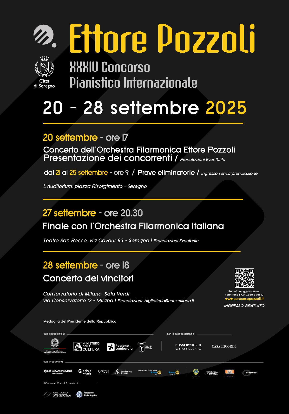 Sabato 20 settembre 2025 avrà inizio la XXXIV edizione del Concorso Pianistico Internazionale “Ettore Pozzoli” che si concluderà, con la proclamazione del vincitore, nella serata di sabato 27 settembre presso il Teatro San Rocco di Seregno, sede storica della manifestazione.