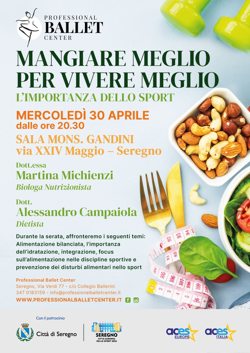 La serata verterà sul tema di una alimentazione bilanciata, una corretta idratazione e integrazione in relazione alle diverse tipologie di sport; non solo, sulla prevenzione dell'insorgere e del manifestarsi di disturbi alimentari.